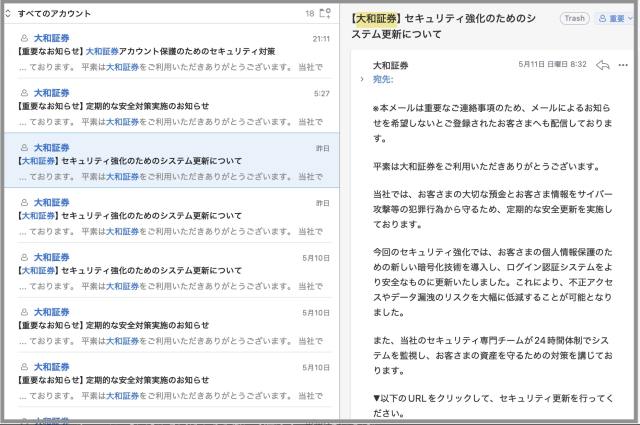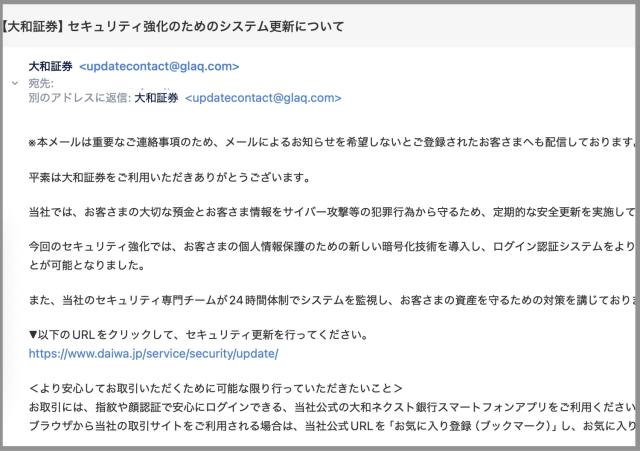 一例を出すと「【大和証券】セキュリティ強化のためのシステム更新について」という件名で、本文を簡潔に説明すると「セキュリティシステムを強化したから、ログインして個人情報を再登録してね」というもの。