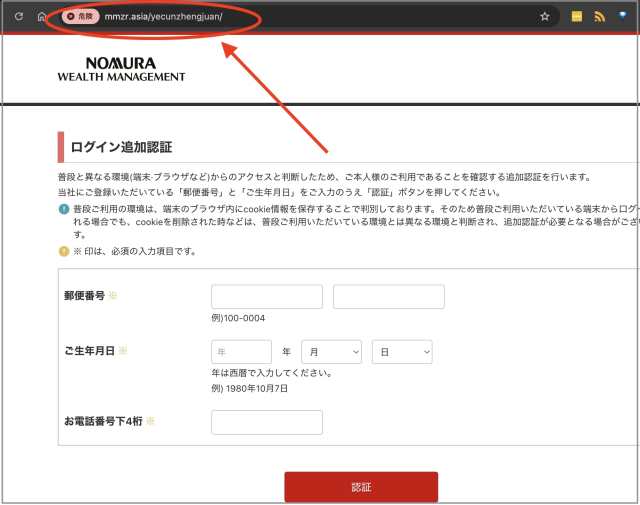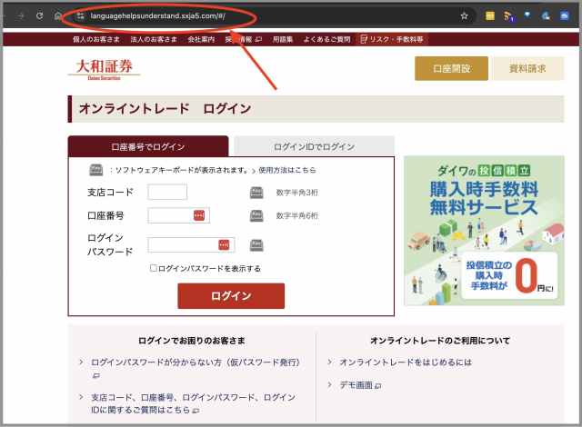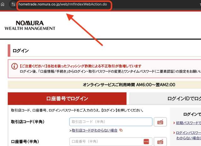 まず、見た目は本物のサイトそっくりだが、URLに注目してほしい。本物の野村證券のURLとは異なるのだ。