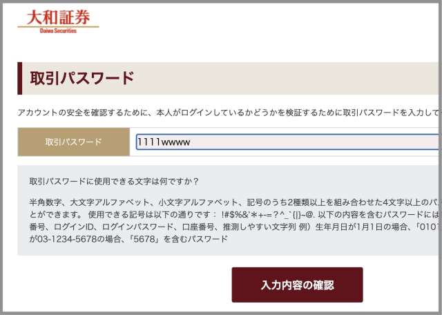 「取引パスワード」の入力フォームでも、適当な英数字を入れると……