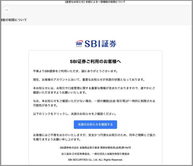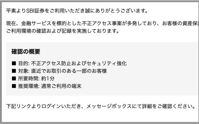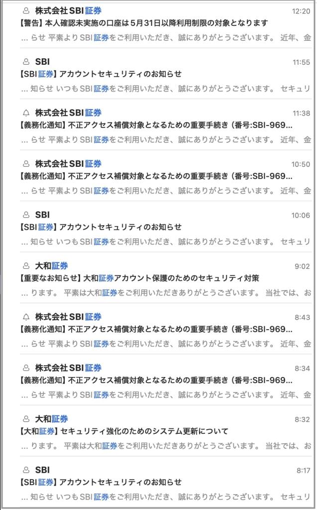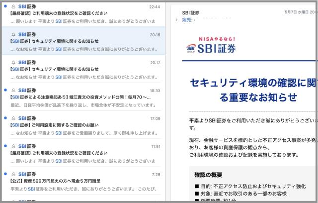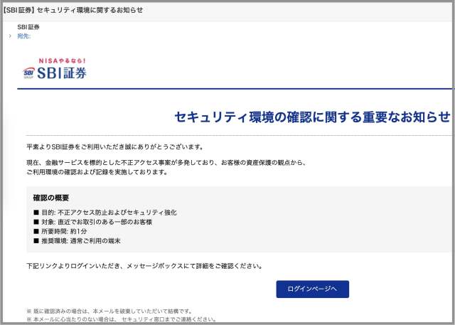 その中でも私の迷惑メールボックスで多かったのは、「【SBI証券】セキュリティ環境に関するお知らせ」という件名のもの。
