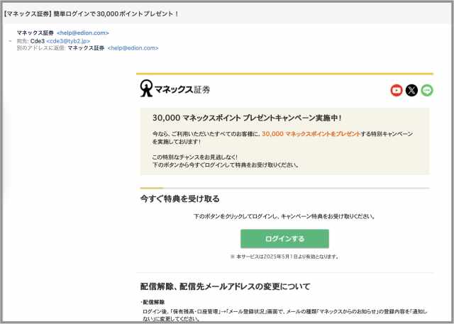 他にも「【マネックス証券】お客様限定特典:専属サービスと豪華宿泊・取引優遇のご案内」など、不正ログインなどの「恐怖」で煽るのではなく、「お得度」に全振りしていた。どちらにしても詐欺だけど……。