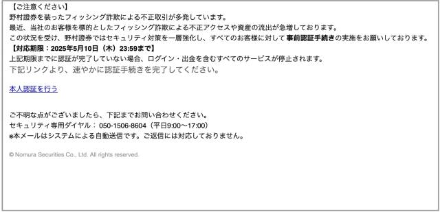 本文は「野村證券を装ったフィッシング詐欺による不正取引が多発しています。」で始まるような “お前が言うなよ” 的な内容だ。