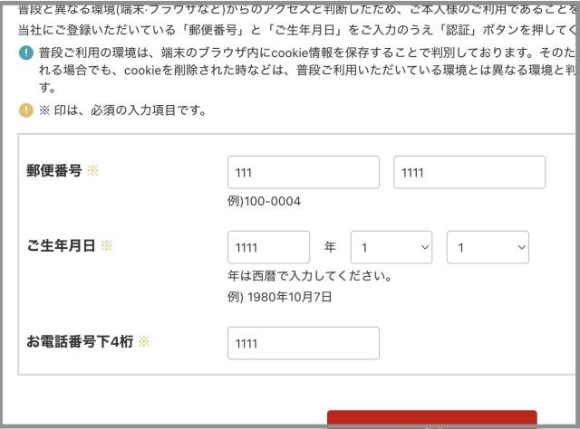 そのままログインに必要な情報を、「1」のみで入力したのち、個人情報の抜き取り完了。