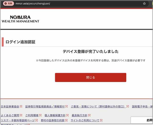 数秒後、本物の野村證券のログイン画面に飛ばされる。