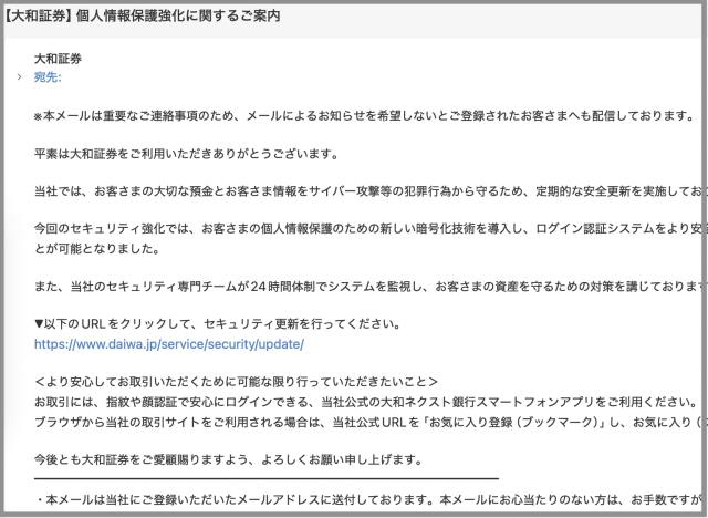一例を出すと「【大和証券】セキュリティ強化のためのシステム更新について」という件名で、本文を簡潔に説明すると「セキュリティシステムを強化したから、ログインして個人情報を再登録してね」というもの。