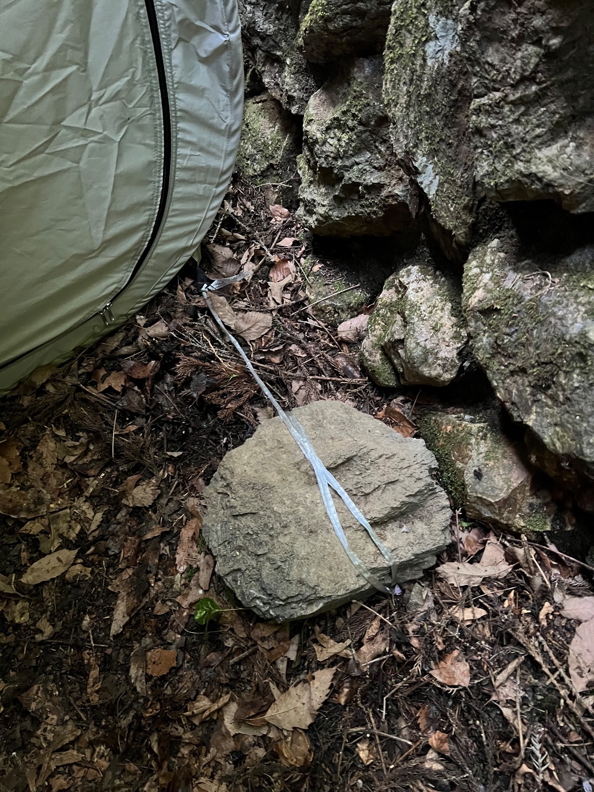 柔らかい土のため固定用の「ペグ」は利かないので、デカイ石とヒモで繋いで強風でも飛ばないようにしておいた。