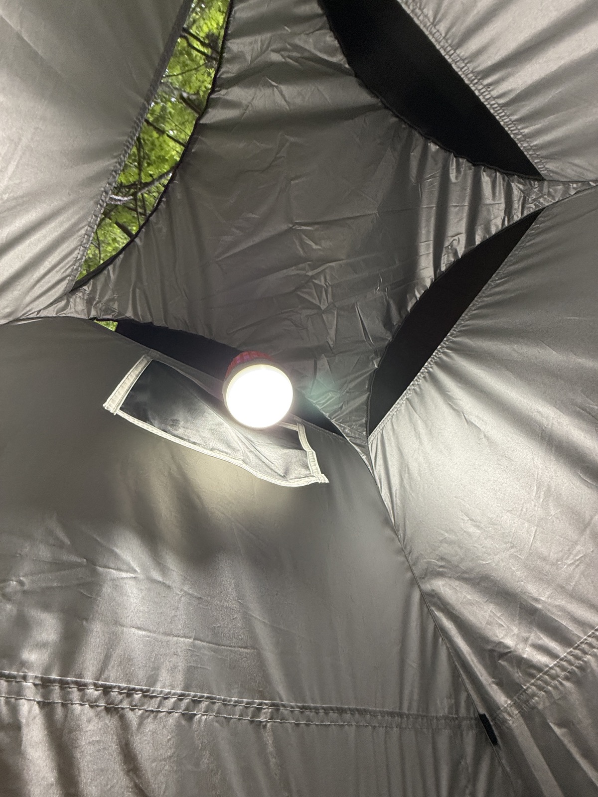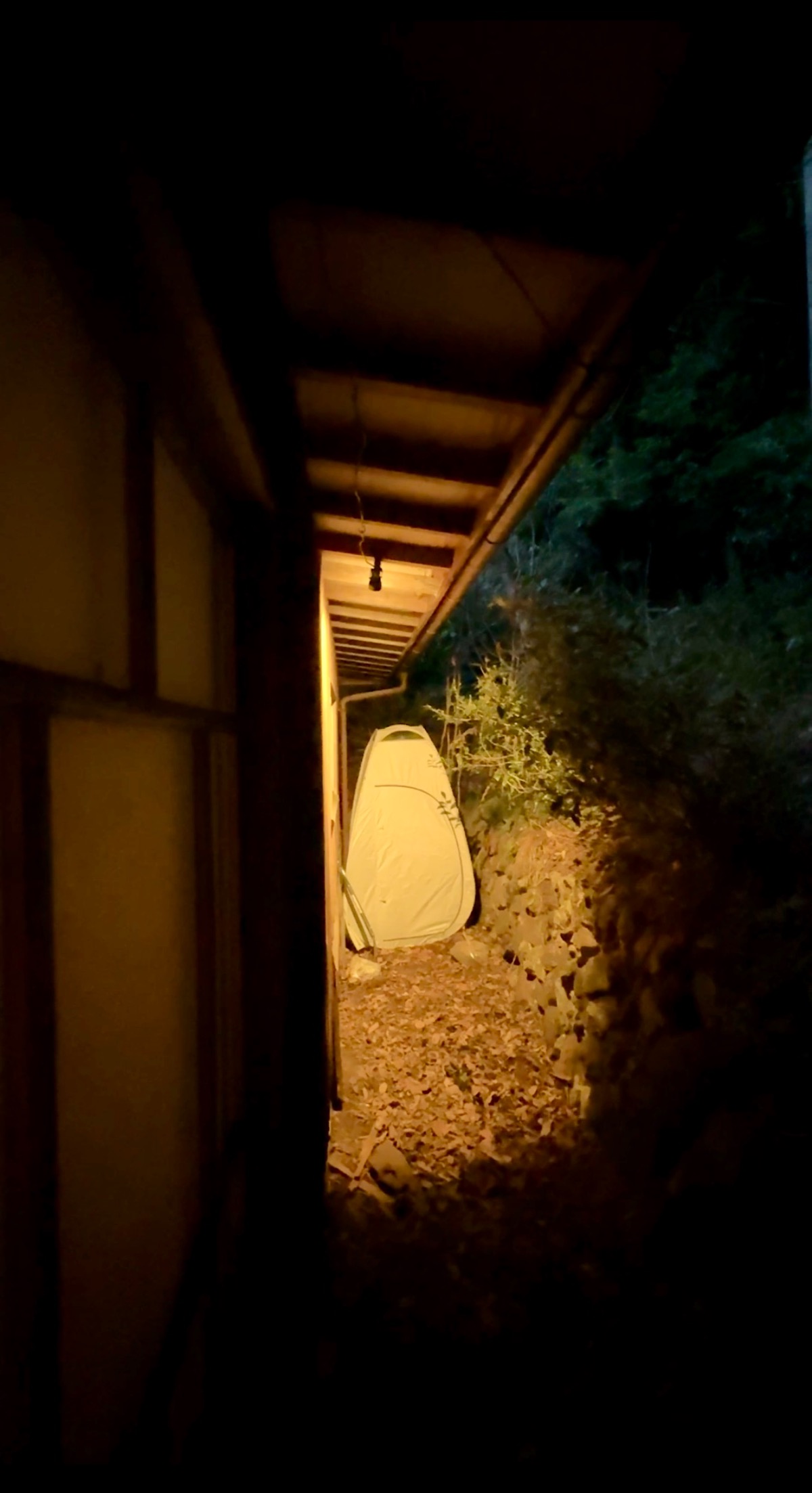 こいつをテント上部にフックで吊るせば、蚊などの対策になるだろう。よしよし。これにて屋外トイレ完成である。