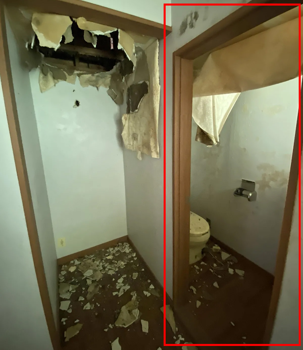 トイレ、あるっちゃあるのだが、天井が落ちてきていたりで完全に地獄。とても用を足せるような状態ではない。ちなみに水洗ではなく汲み取り式だった。