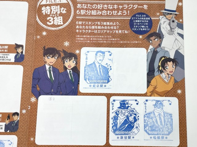……なんだけども、実はまだある。「コナンスタンプラリー」には全駅コンプリートとは別に、好きなキャラを6駅分組み合わせて、3組のペア作るというミッションもあるのだ。