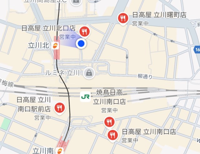 歩いて3分の距離にまたまた日高屋が! 都心のコンビニかよ!! 調べてみた結果、なんと立川駅周辺に4店。焼鳥業態を含めると5店もあることが判明した。え、日高屋で結界でも張ってんの? 多すぎじゃない?