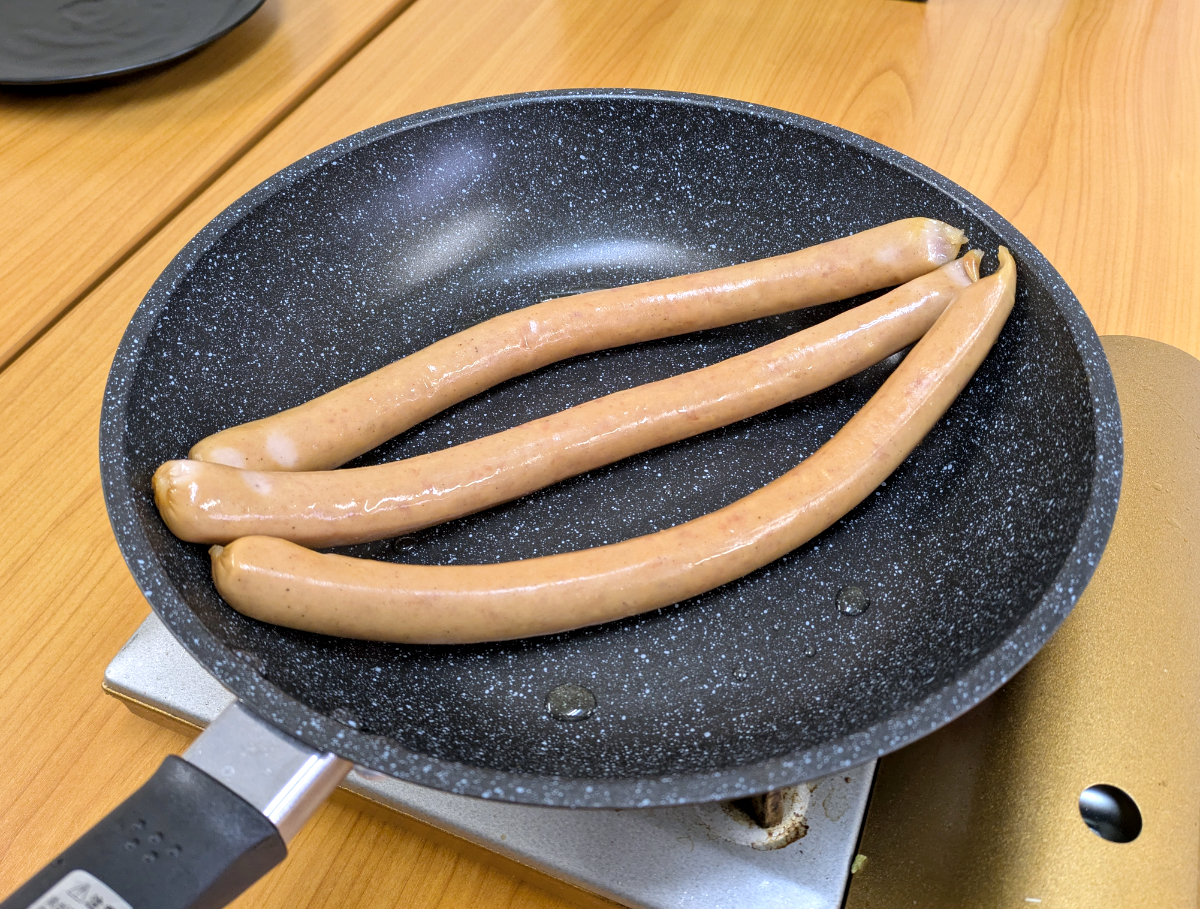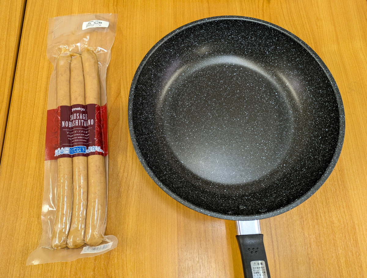 ではさっそく調理したいと思う。だが、ここで1つ問題が……。ソーセージが長すぎてちょうど収まるフライパンがない。編集部にあるもっともデカいフライパンでもこの有様だ。