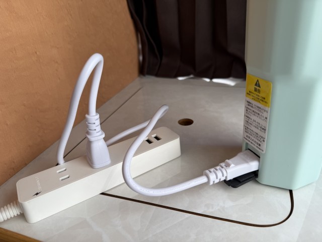 実際に車内に持ち込んで使ってみよう! セッティング中に気づいたのだが、付属の電源コードがかなり短く、延長コード必須だ。これはマイナスポイント。家庭のキッチンでも、これほど近くにコンセントがあるシーンはそうそうないのでは。