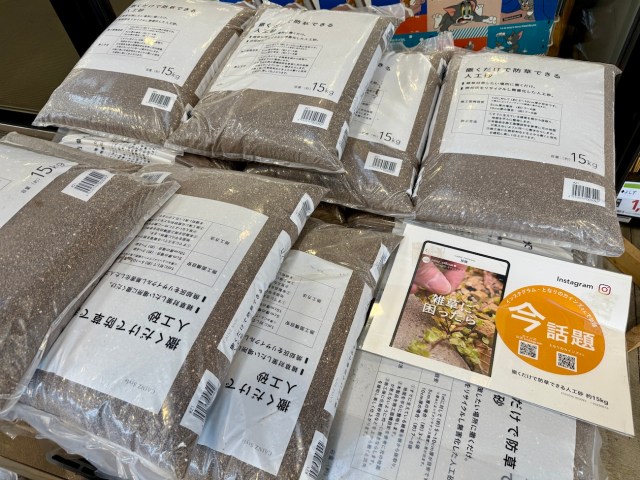 とにかく低コストで雑草対策をしたい! というわけで、安い除草・防草グッズを手に入れるべく近所のカインズに足を運んでみたところ……店頭で「撒くだけで防草できる人工砂(598円)」なる商品を発見!