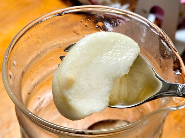 ベースは烏龍茶だが、フルーツの味の方が強いので、どちらかというとデトックスウォーターみたいな味。砂糖とはまた違うフルーツの甘みなので、すっきりと飲めるぞ!
