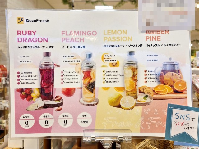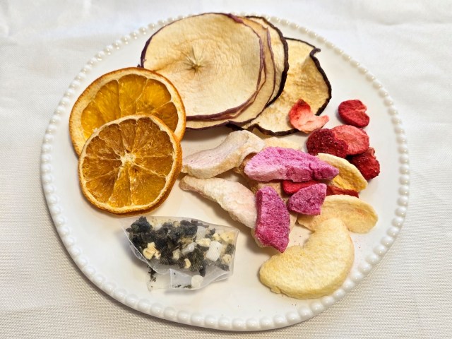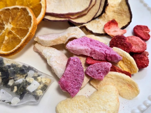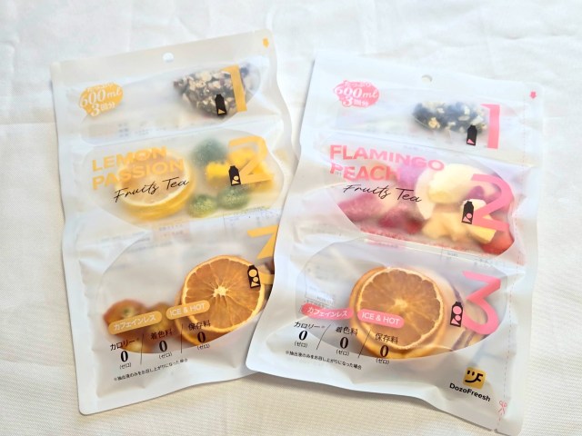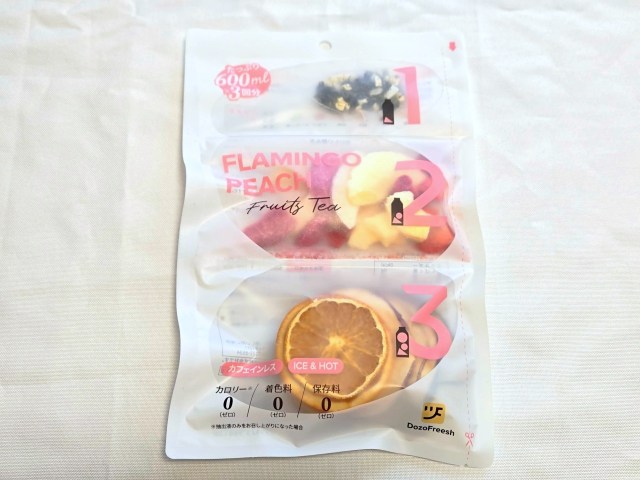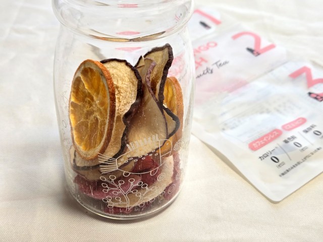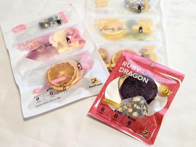 そんなフルーツティーの常識を打ち破ったのが、今回購入した「DozoFreesh」のフルーツティー。フルーツ本来のおいしさを味わってもらうため、使っているフルーツは砂糖も添加物も不使用のガチなドライフルーツなんだとか。