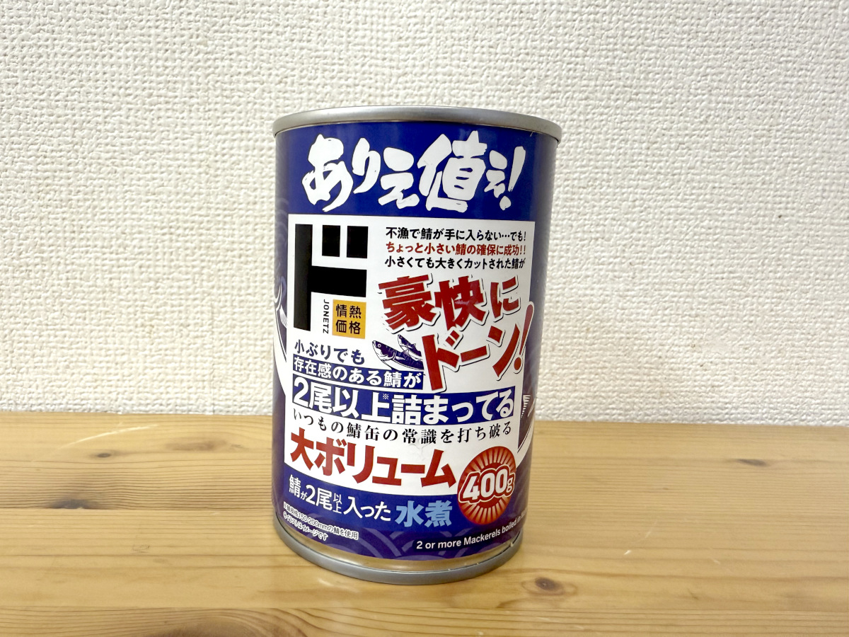 さて、そのサバ缶とは「鯖が2尾以上入ったさば水煮缶詰」のこと。ドン・キホーテのプライベートブランド「情熱価格」のラインナップで、価格は1つ430円だ。
