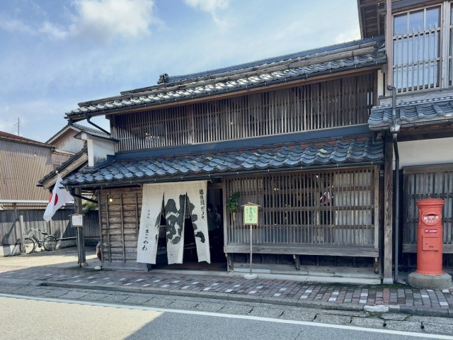 糖分を補給して散策再開。町屋通りは、端から端までゆっくり歩いても10分ほど。古い建物が立ち並ぶが、ひときわ存在感を放っている一角があった。「千年鮭きっかわ 本店」だ。