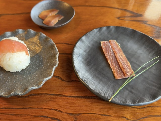 先ほどの町屋見学で、何か月も寒風に吹かれることでアミノ酸が凝縮するという話を聞いてきた。「酒びたし」は旨みあふれる鮭のジャーキー。「白子の寒風干し」はねっとりとした濃厚な食感が味わえる珍味だった。ほんのひとかけらなのに、口の中に残る存在感がすごい!