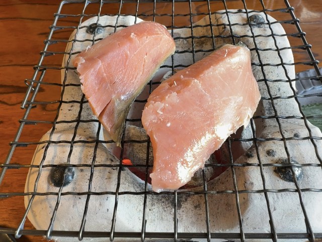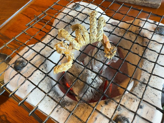 続いて登場したのは七輪だ。まずは「鮭の酒びたしの皮」を焼く。ドラゴンのうろこのような皮を七輪に載せると、くるくると踊り始める。カリッとした食感が楽しい。