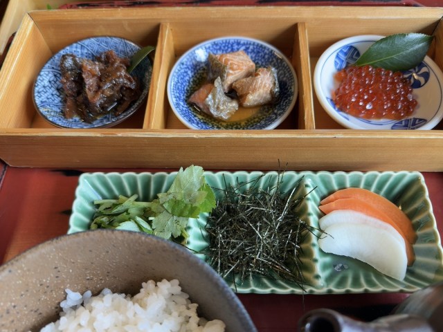 「はらこの味噌漬」(写真上段の右)は濃厚な魚卵にさらに味噌のコクが加わり、無限にご飯が進む。「鮭のかぶと煮」(写真上段の左)は佃煮のような懐かしさのある味だった。