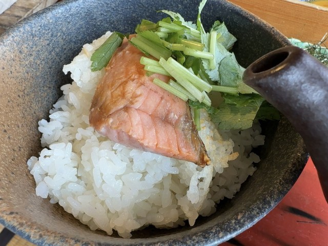 米どころ新潟、土鍋でほっかほかに炊かれたご飯が美味しくないわけがない! 出汁はまろやかな地元の村上茶。鮭はそのままでもかなり味が濃く、塩気を感じるが、出汁をかけることで優しい味に変化する。鮭の旨みが溶け出た出汁もまた、飲み干したくなる美味しさ!