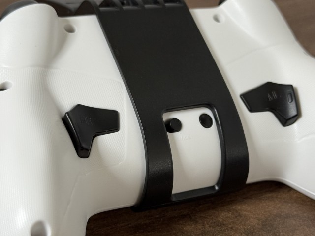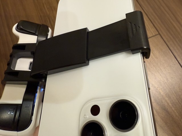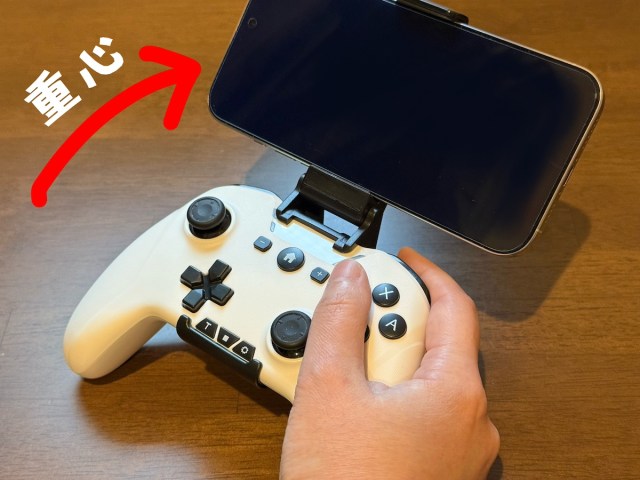 ただ、軽量なコントローラーに対し、スマホ本体は200g以上あるから、重心がかなり上にくる。奥側に引っ張られるような感覚があり、持っていると手首に負担がかかる。