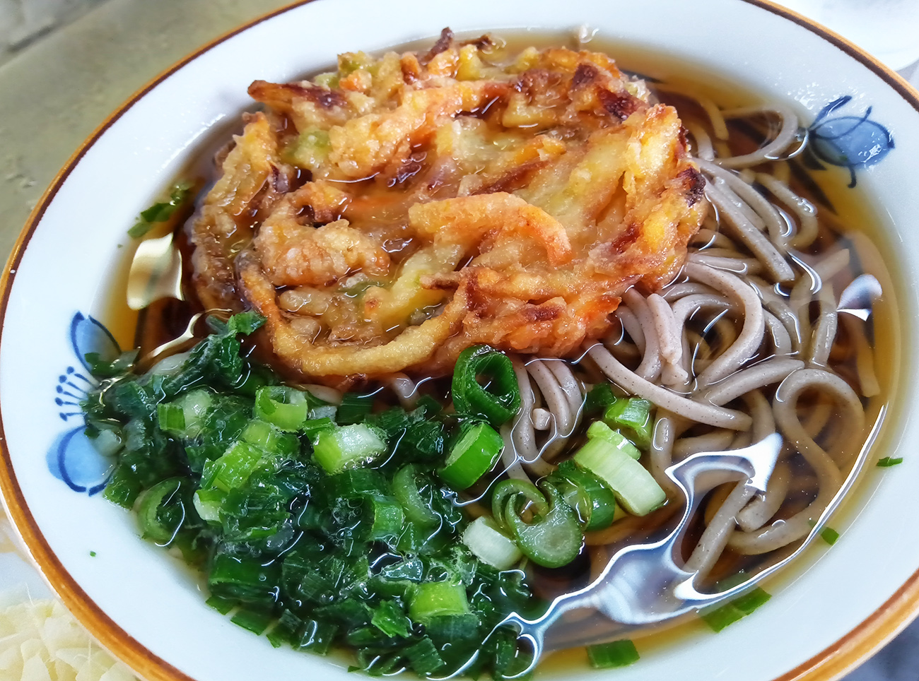 それはつゆを温める時にかき揚げ天を鍋に浮かべていること。基本、天ぷらってサクサクさをアピールしている店が多い。それは立ち食いそば屋でも同じだが、このスタイルはその真逆。確かに、そば屋の天ぷらはつゆが染みこんだ衣も良さではあるけど、ここまでガッツリつゆで茹でているのは初めて見た。
