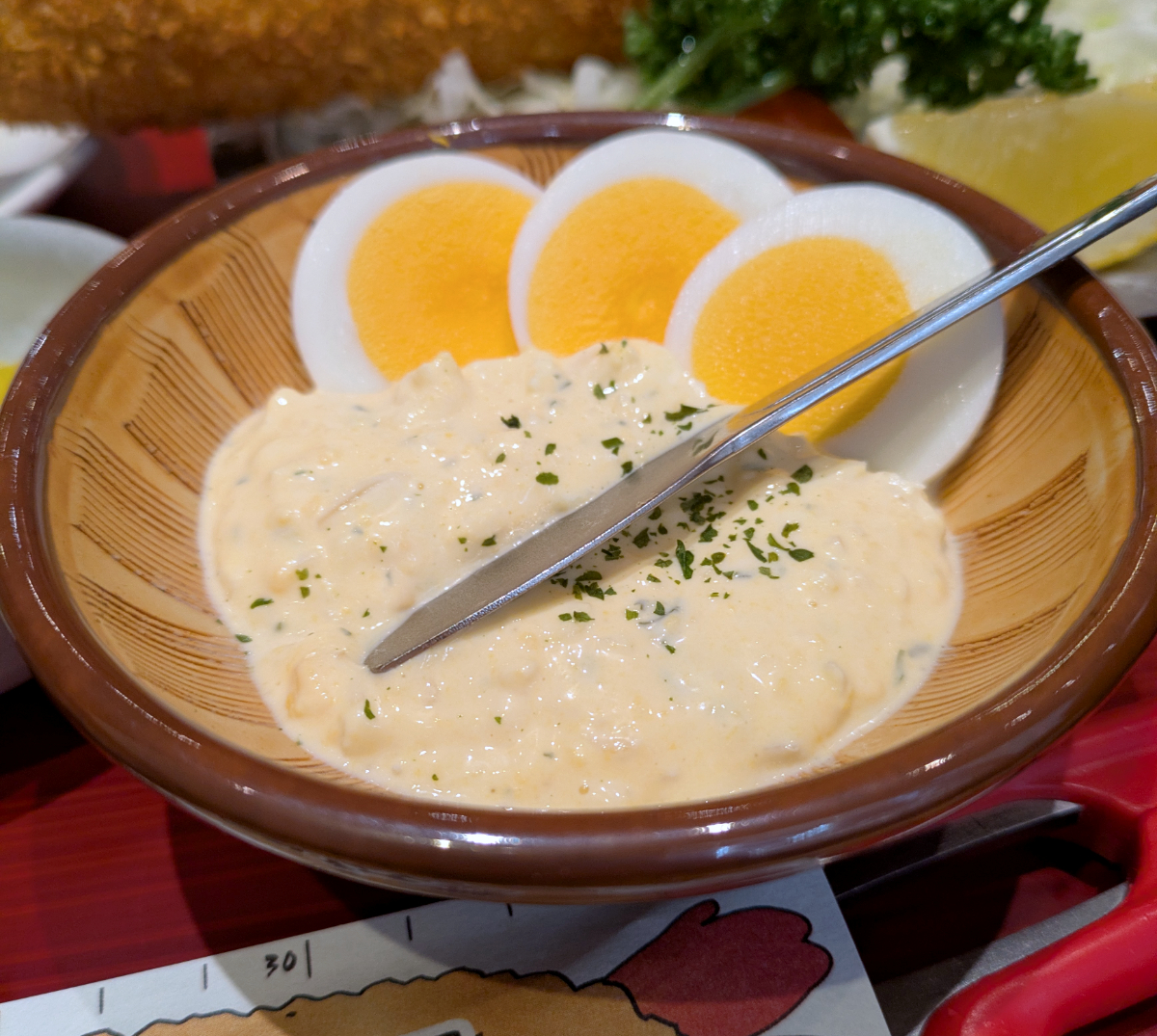 「海老どて」と名付けられたお店なので、本来はどて味噌ソースにつけて食べるべきだろう。だが、どて味噌ソースは別料金(税込319円)だ。幸い、自分で卵と合わせるタルタルソースがついていて、卓上にはウスターソースもある。どてソースなくても美味しく食べられそうだ。