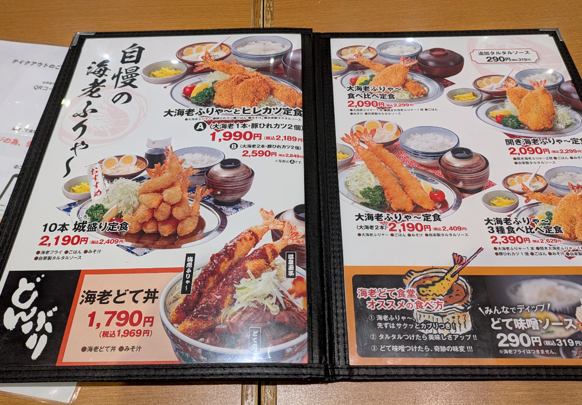 メニューの表紙には、看板商品の海老フライ各種がサイズ付きで紹介されている。大・特大もさることながら、ひらき(開き)まであるなんて!