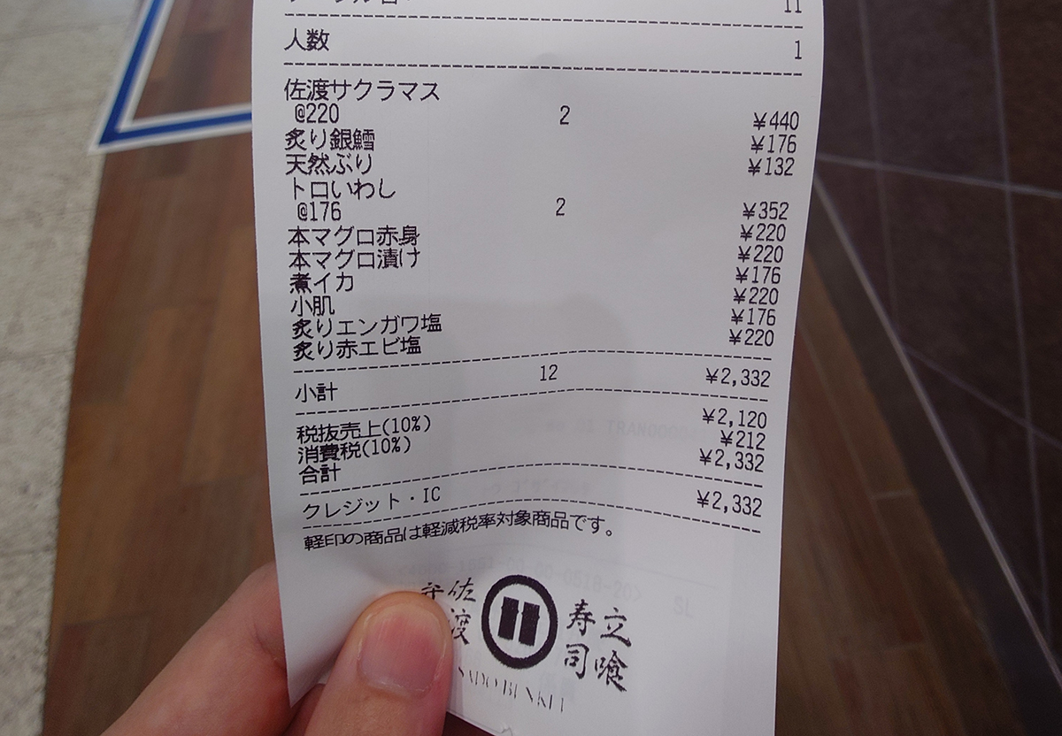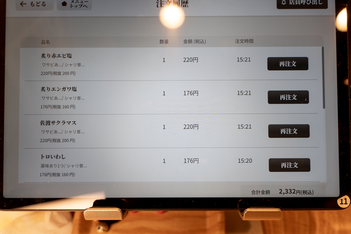 値段ではなく、ネタの種類で気になる寿司だけを12貫選んで2332円。価格的にも大手寿司チェーンと大差はないだろう。