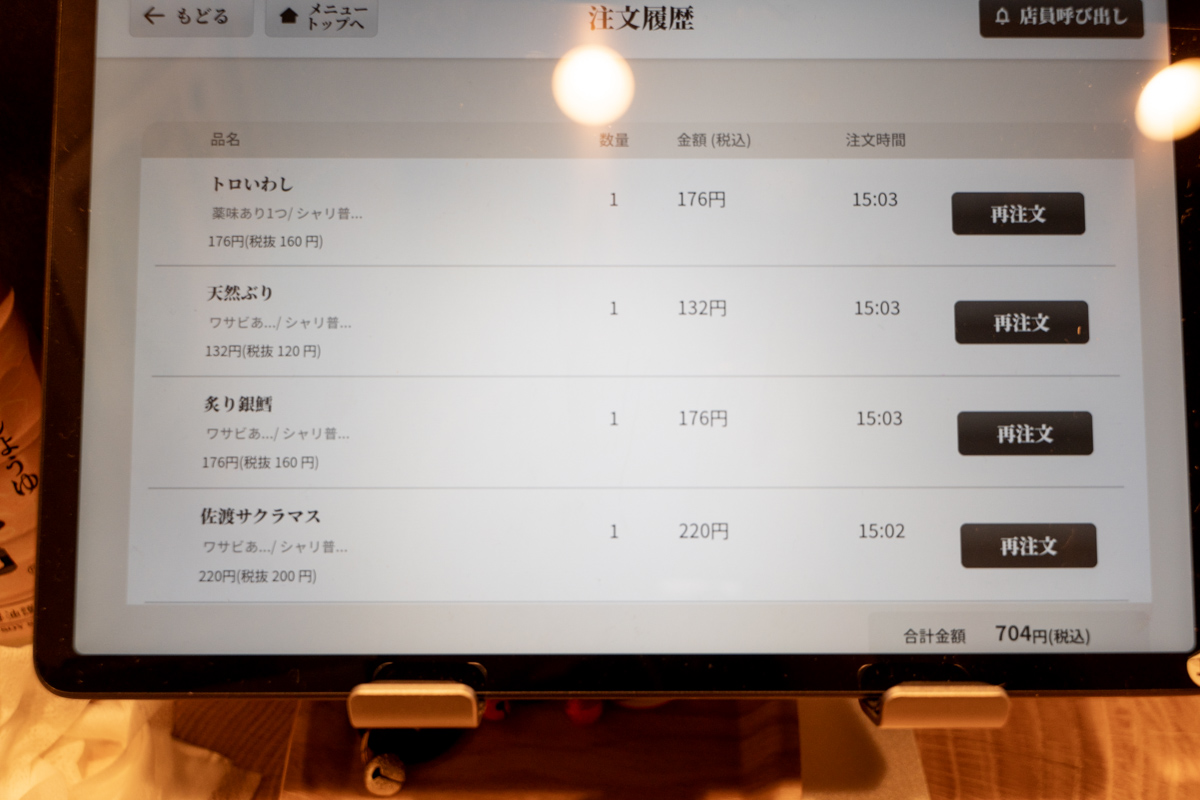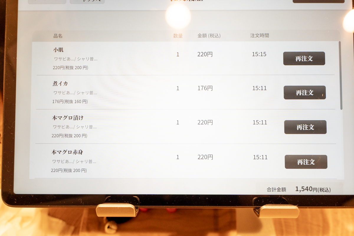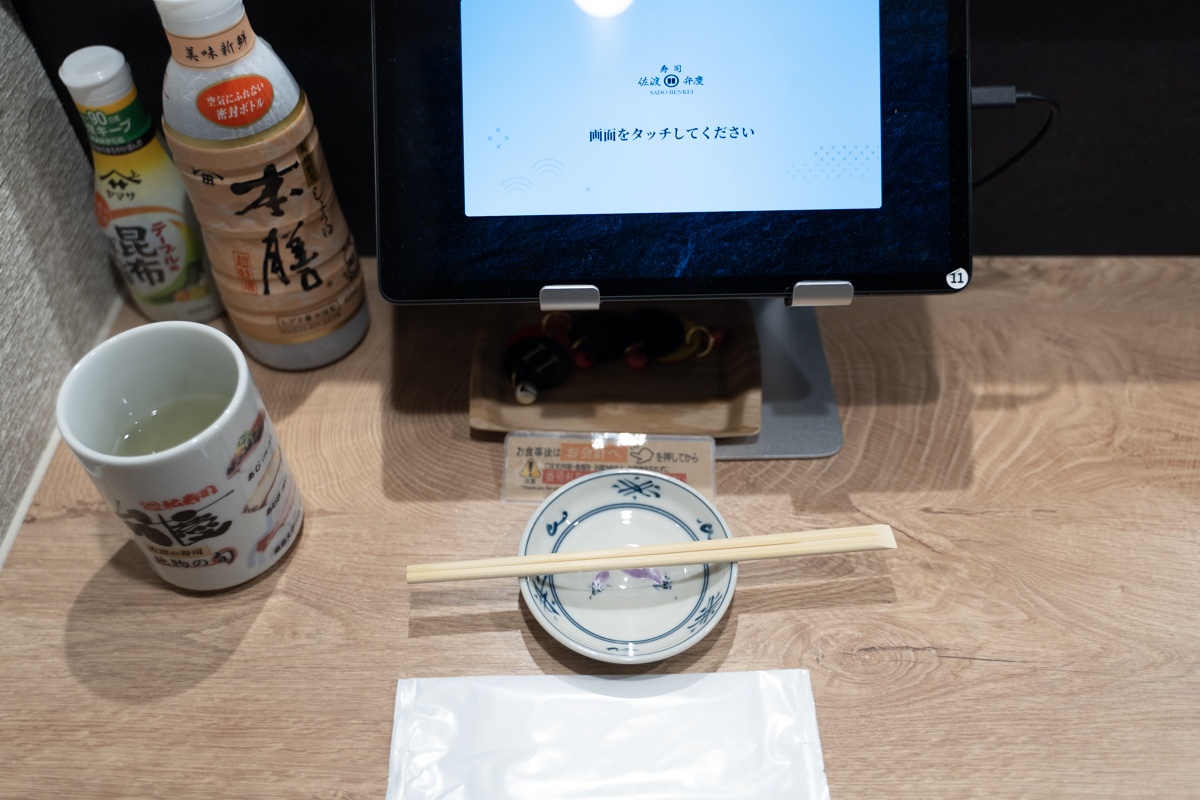 立ち食いなので、全てカウンターだ。約10人くらいは入れる感じだろうか。1人分のスペースに注文用のタッチパネルと醤油などがセットされているスタイル。