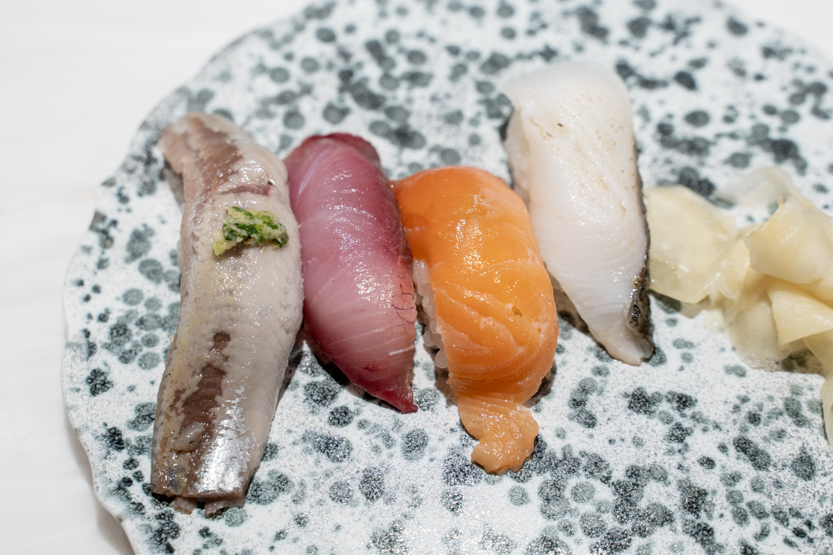 オーダーは全て、目の前で寿司シェフが握り、カウンター上のイイ感じの皿に乗せられる。