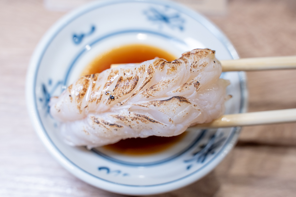 この「炙り赤エビ塩」はお勧めだ! 表面は香ばしい炙りフレーバー。内側はプリプリで、甘みが濃く、エビを食べている実感が脳に染みわたる寿司だった。