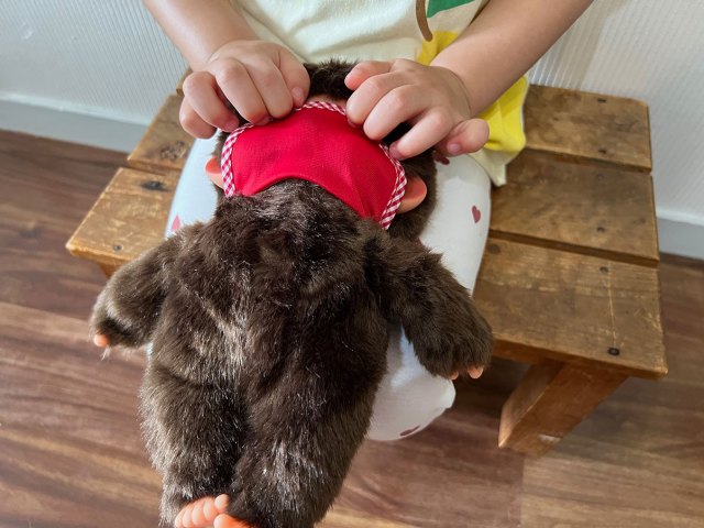 なるほど。たしかに、前かけをしている ぬいぐるみって珍しいかもしれない。ただ、娘的に違和感を覚えたのはその程度で、全体的には気に入った様子。やはりモンチッチの可愛さは時代を越えるようだ……と思ったら!