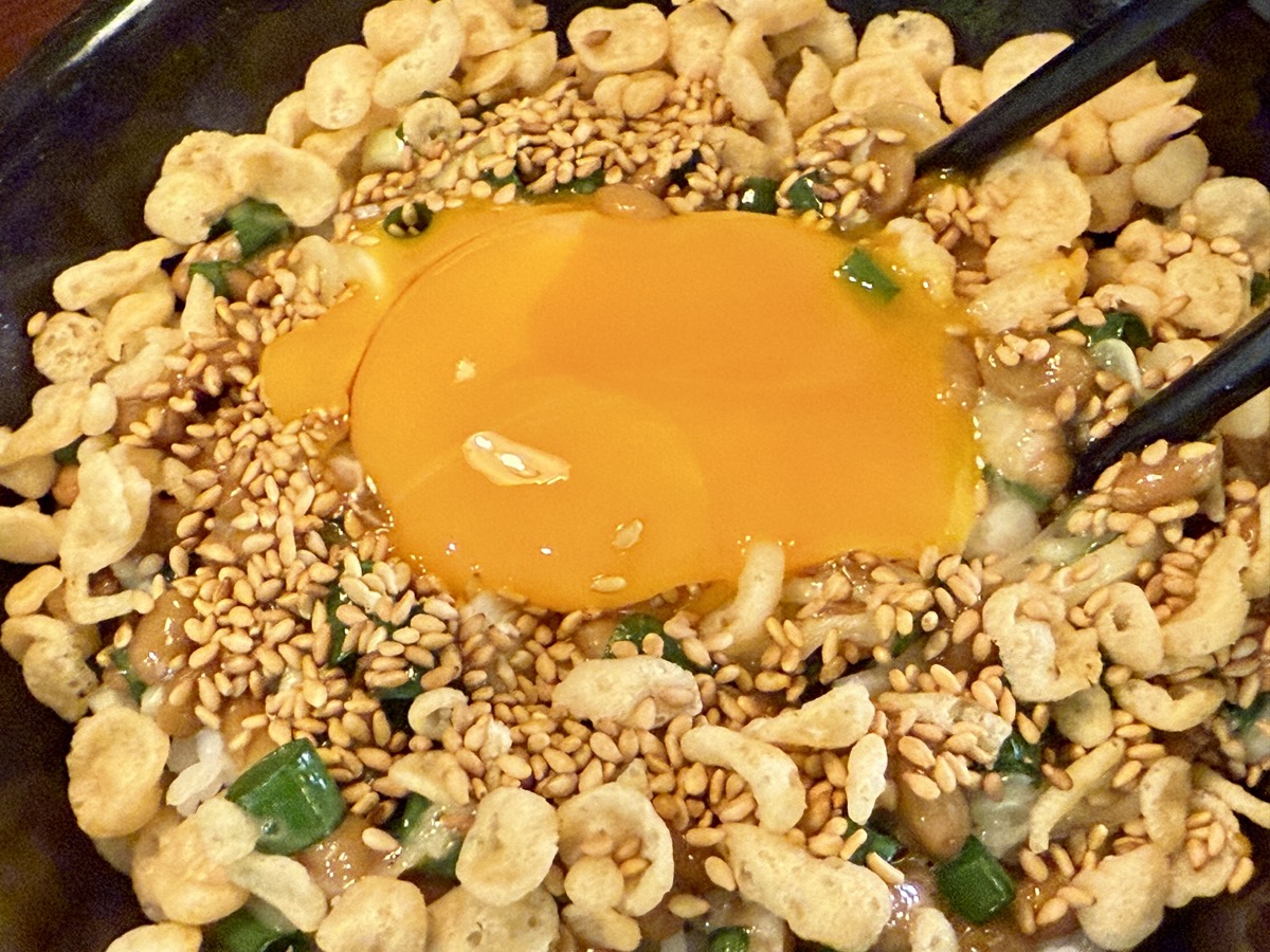 それとも、ネギのダブル効果か。いや、天かすの食感の楽しさか。いいや、健康 (納豆)と罪深さ (天かす)のコントラストか。いいや、いいや……