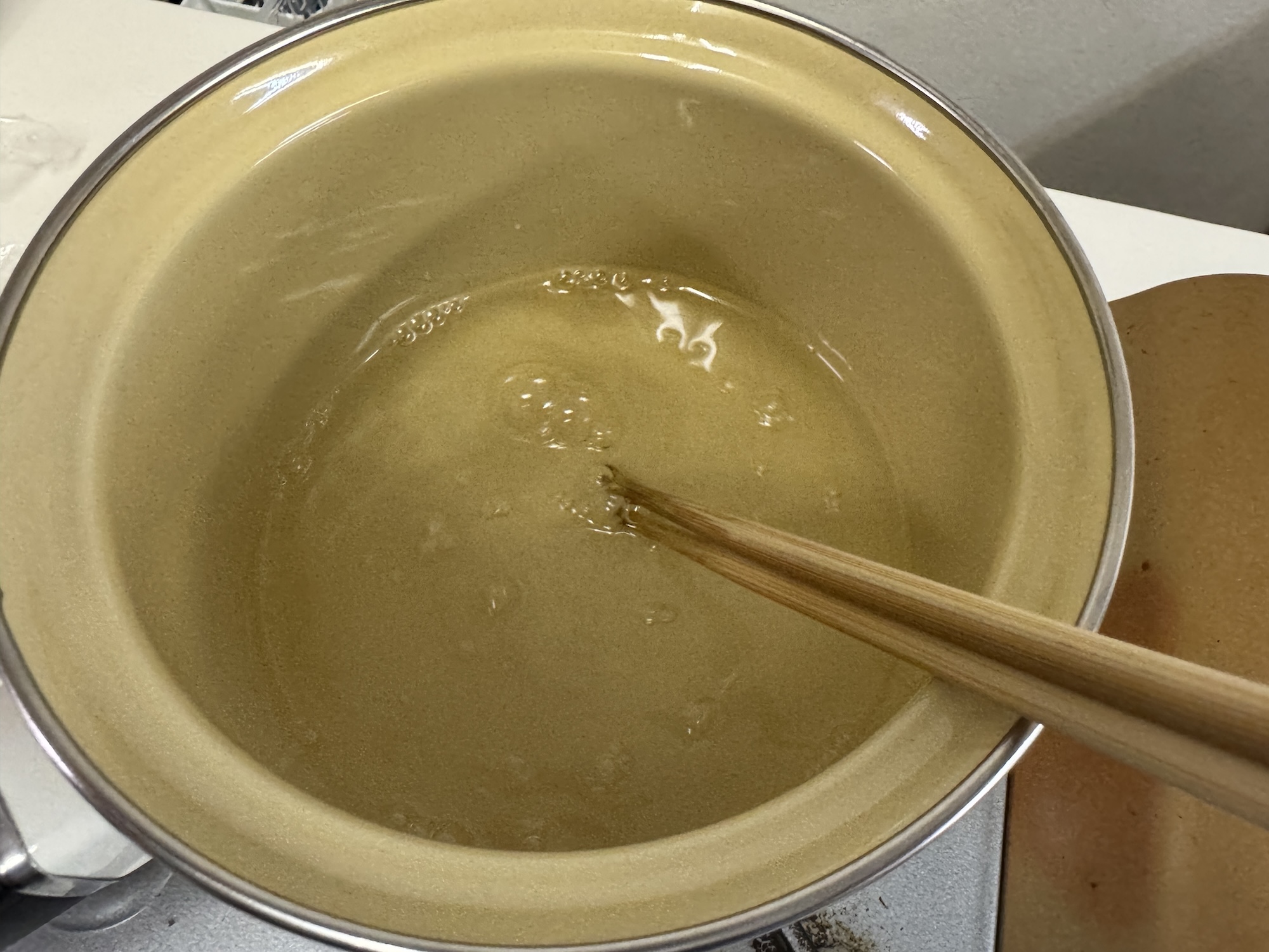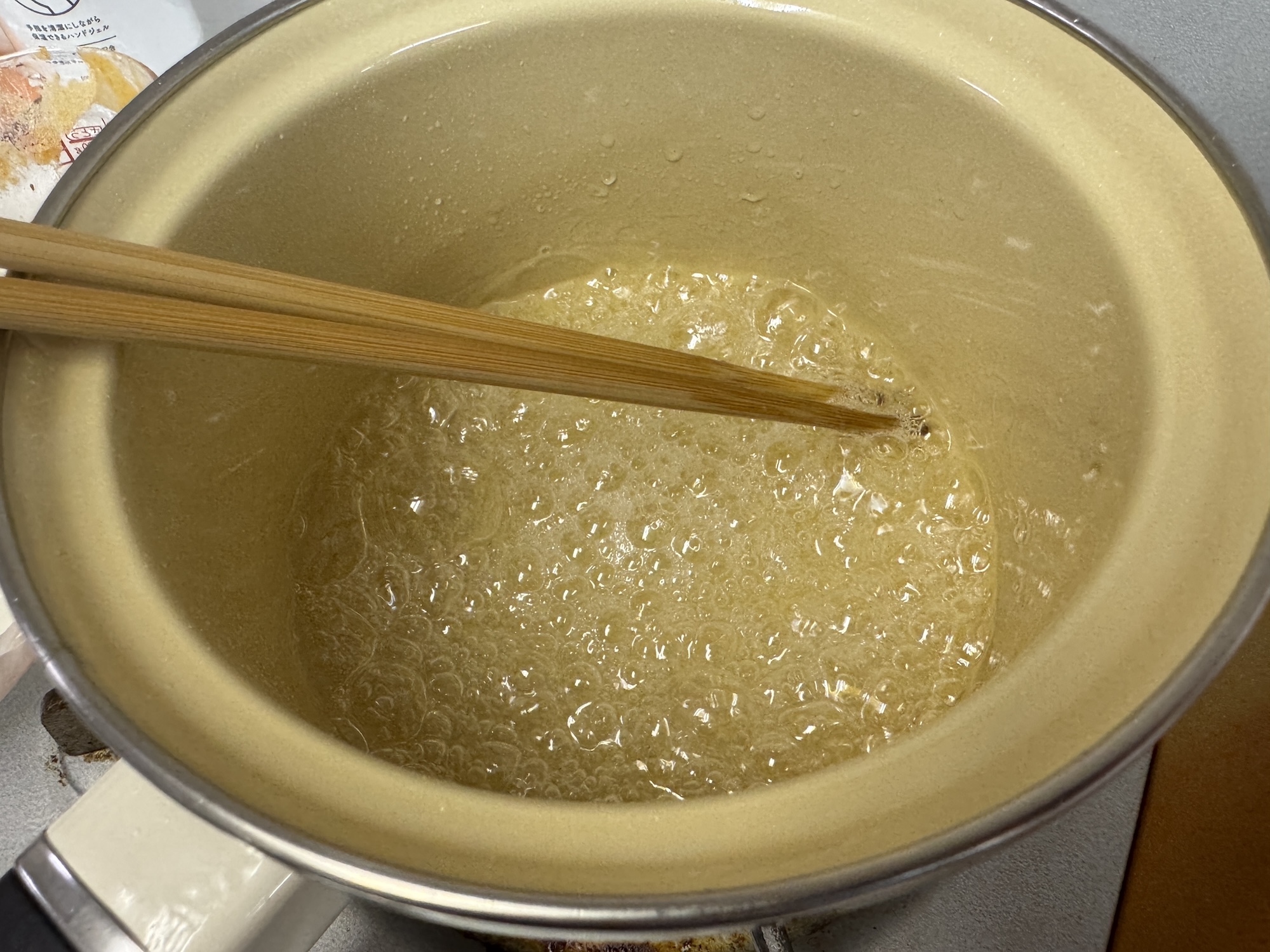 弱火で3分ほど煮てみたところ、まだシャバダバの水だ。たぶん “とろみ” 的なものが発生しないと、生地に絡まないよね?