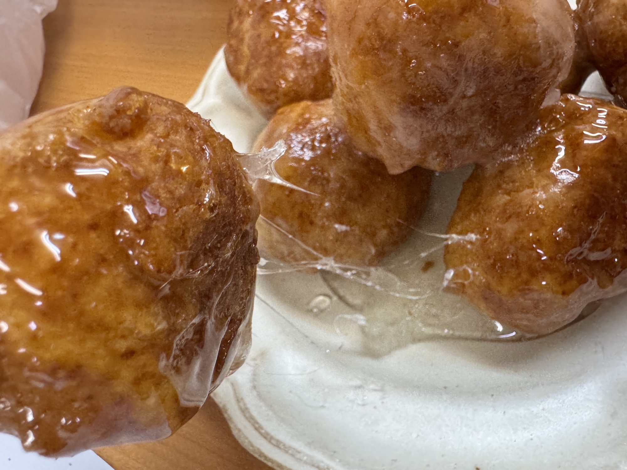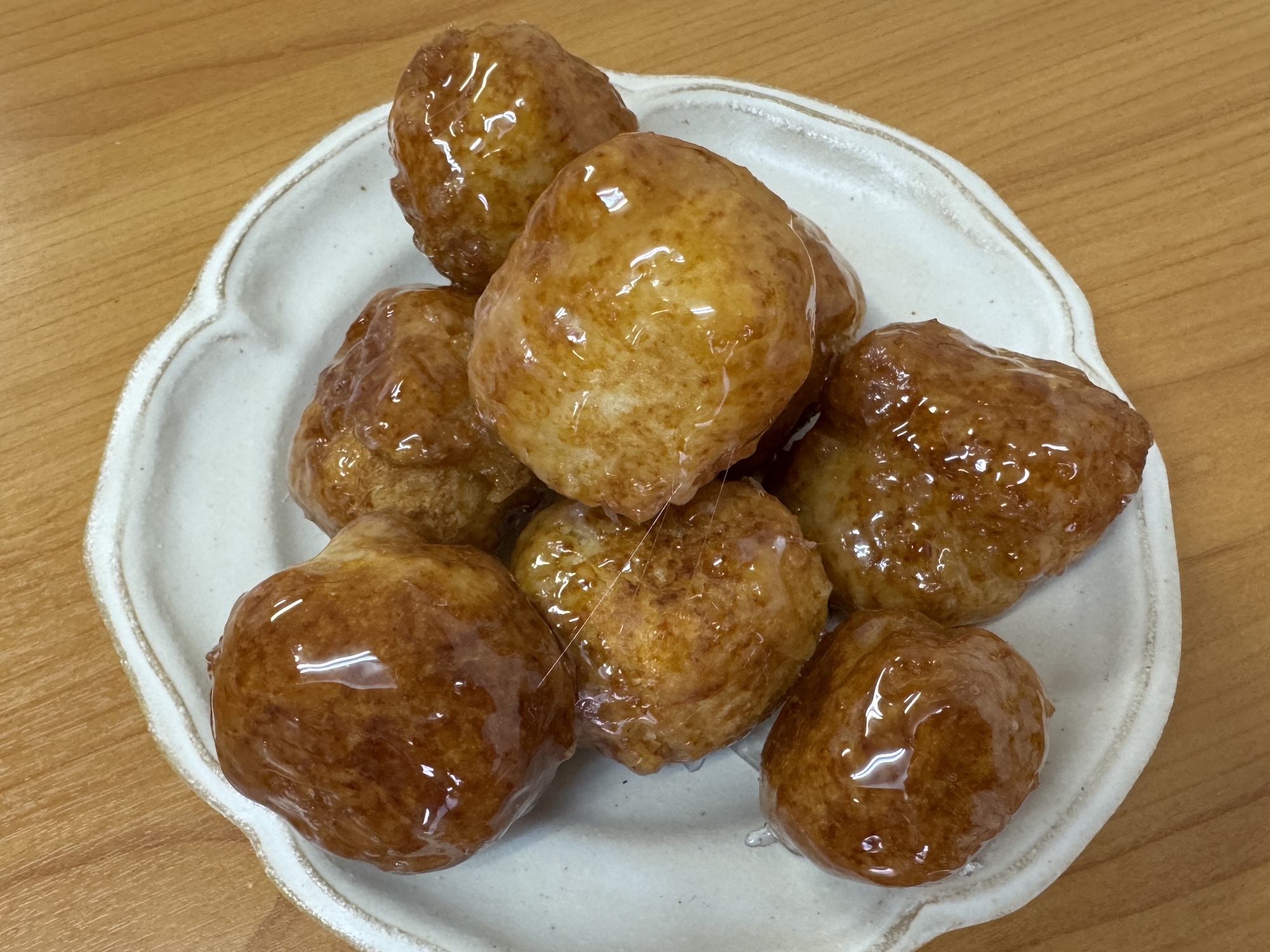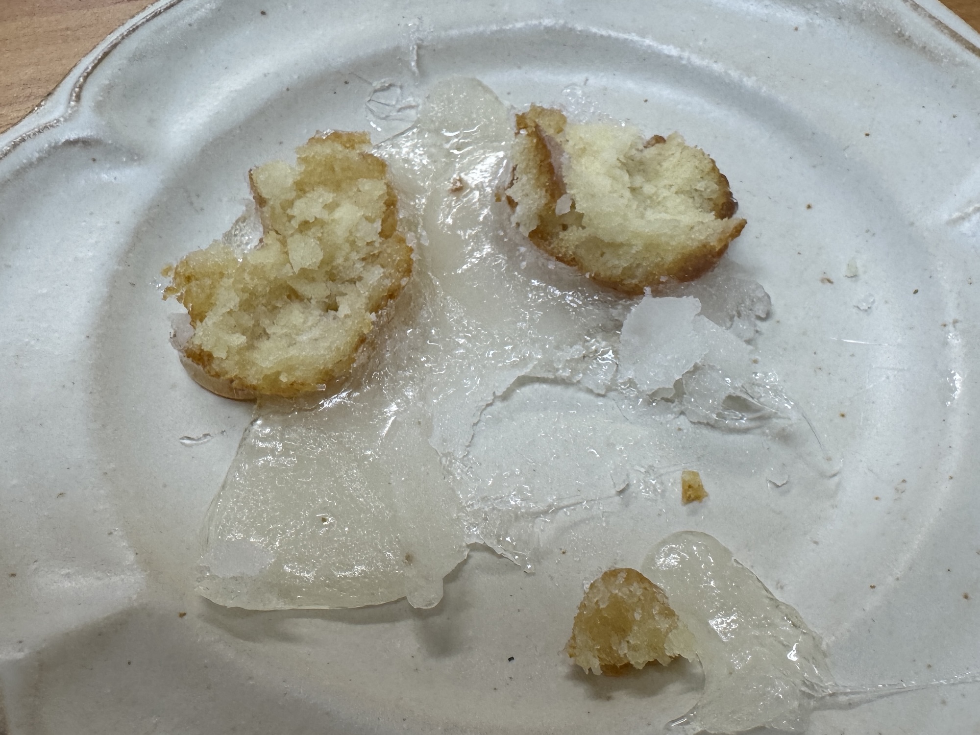 御花畑「これ、何? おいしいんだけど、シロップのネチャネチャが強すぎて歯にめちゃくちゃくっつく。生地自体がおいしいから、上のシロップはなくてもよかったのでは? とにかく食べにくいのが難点。噛めないレベル」