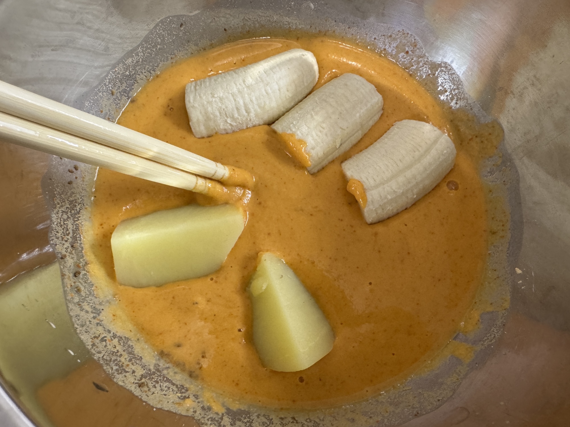 すっかり疲れてしまったが、残るBAJJI BONDAに取りかかろう。こちらは「天ぷら粉」的なノリっぽい。粉を水でとき、じゃがいも、バナナ、ナス等にからめる。