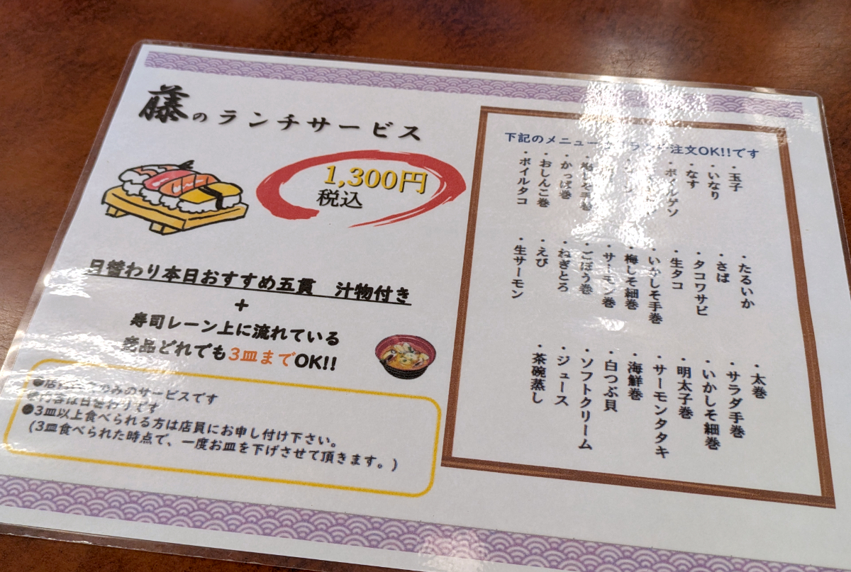 今回の狙いはランチサービス、提供価格は税込1300円。それでおすすめ5貫に汁物。さらにレーンに流れるネタをどれでも3皿食べることができてしまう。絶対コレ、お得だよね。お店の人が自ら「お得です」と仰ってるから間違いないよ。