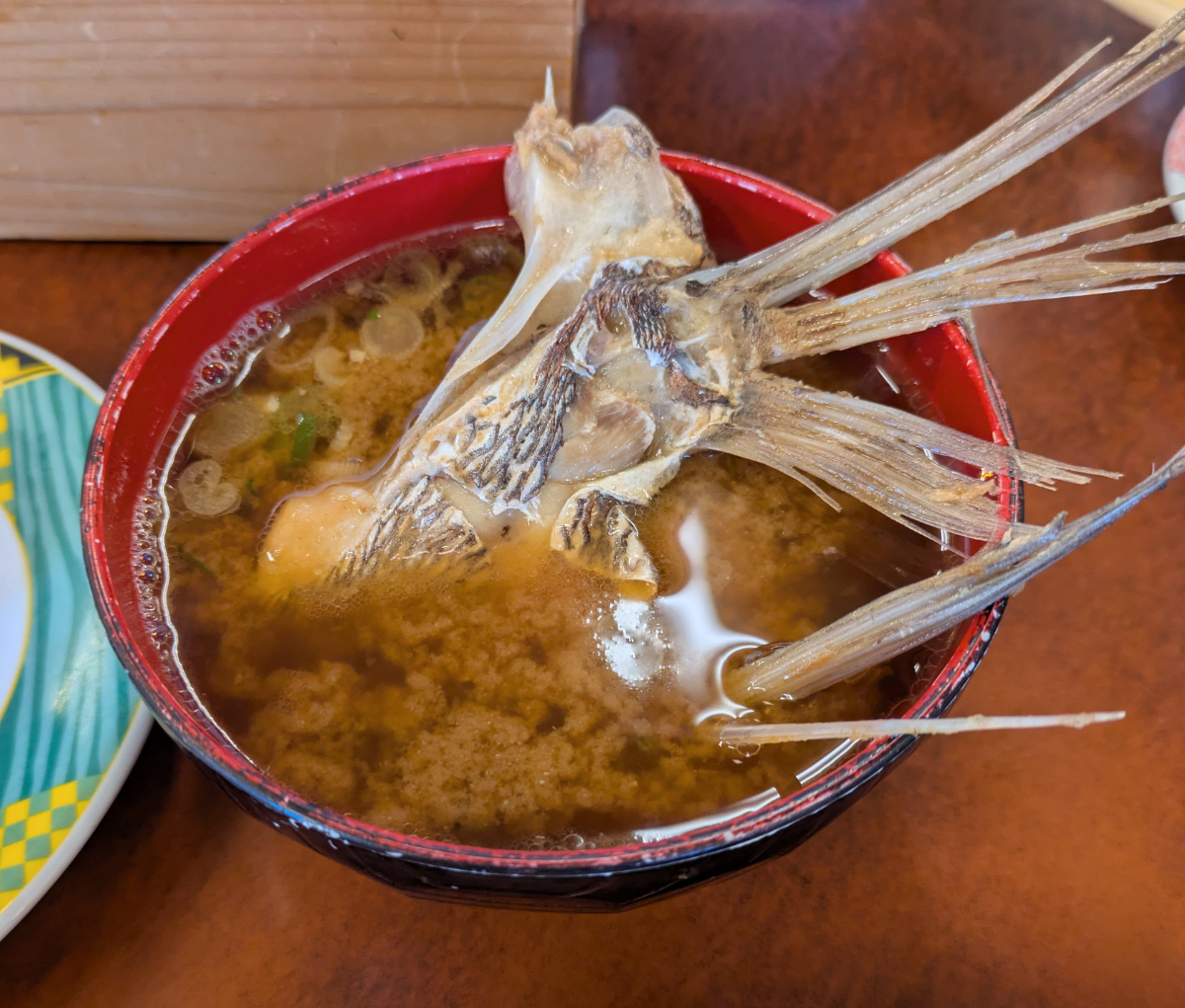 汁物はあら汁。これは鯛のカマかな? 思ってた以上に豪勢だ。器からはみ出しまくってる!