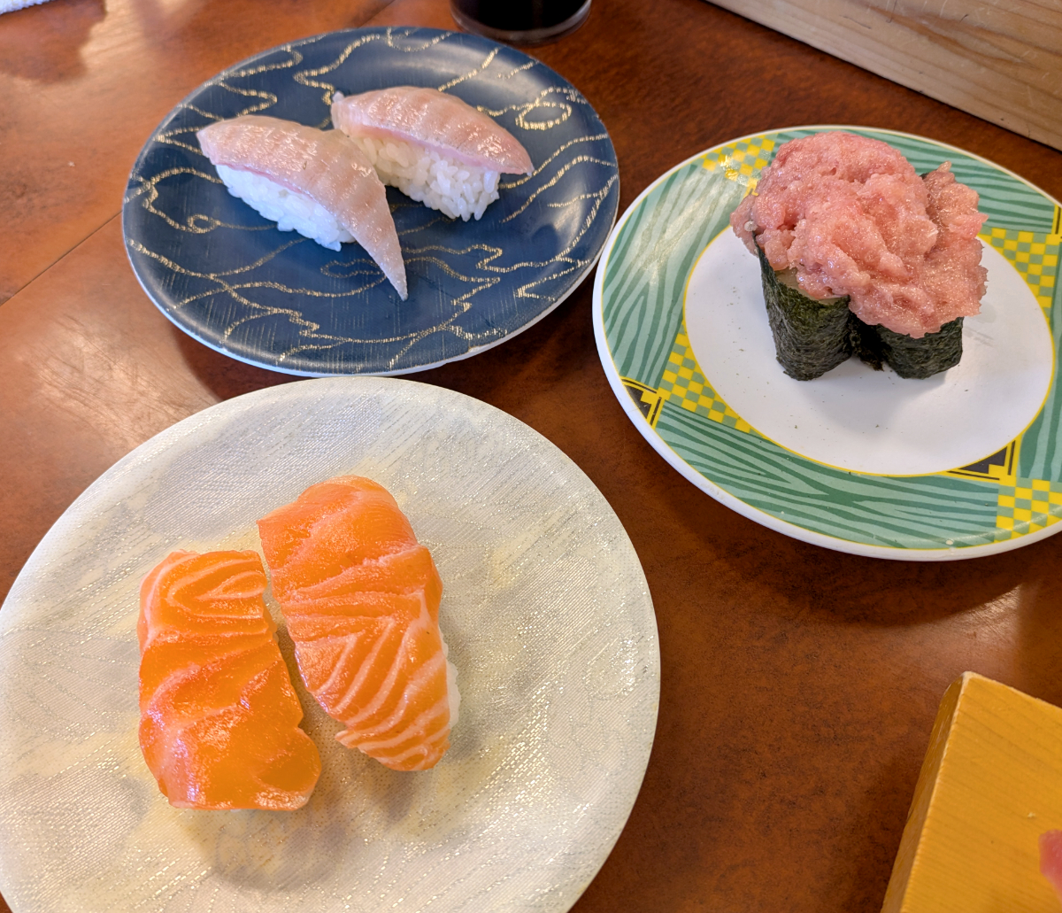 私が訪ねた13時頃は、レーンにそれほど寿司は流れていなかったので、良いネタを取ることができた。普段は11時と12時くらいにレーンにネタが並ぶそうなので、その時間なら選びたい放題なのかも。