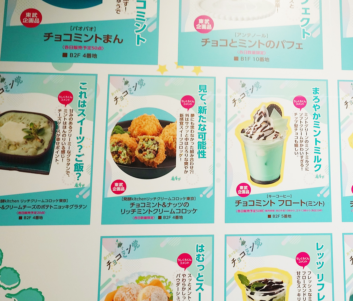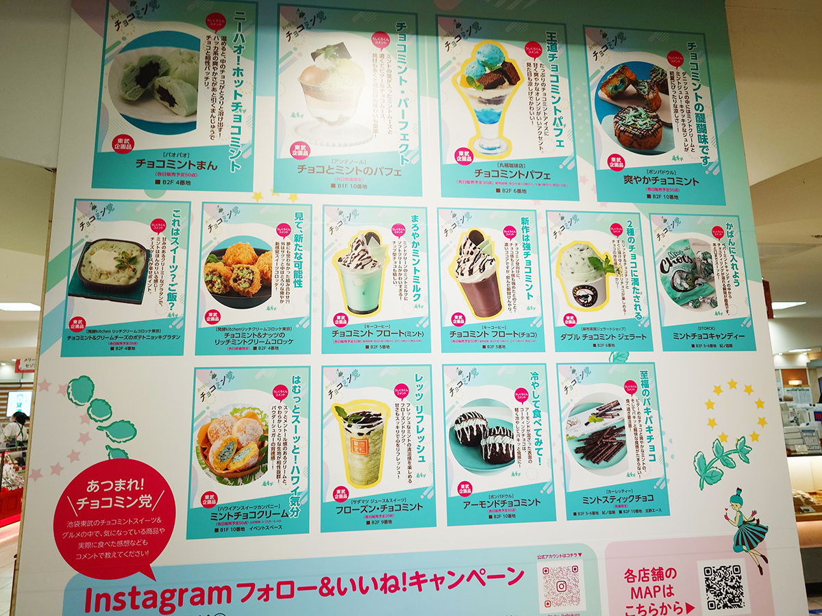 フェアは「あつまれ!チョコミン党」と題されたもので、池袋の東武の地下1階~2階にかけてのフード系ショップが参画しているもよう。