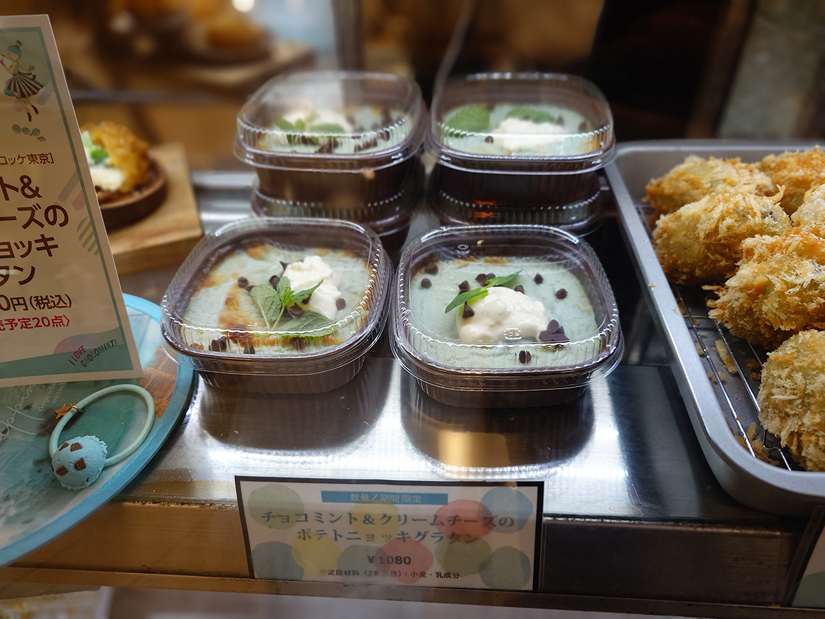 すると、フェア対象はもう1つあるという。コロッケに気を取られて気付かなかった。マジか、これもだいぶ思想が強いぞ……。まさかのポテトニョッキグラタンである。もちろんチョコミント路線で、価格は1080円。