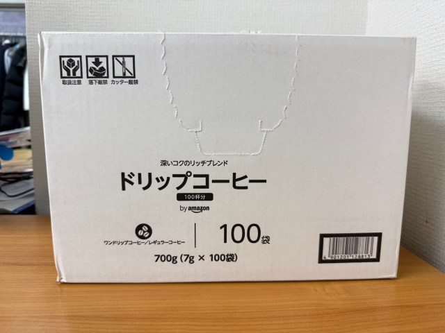 今回Amazonから特別に提供してもらったのは「by Amazon ドリップコーヒー 深いコクのリッチブレンド ダークロースト 100個 UCC製(3418円)」。ダンボールの中にどさっとドリップコーヒーが入っていた。