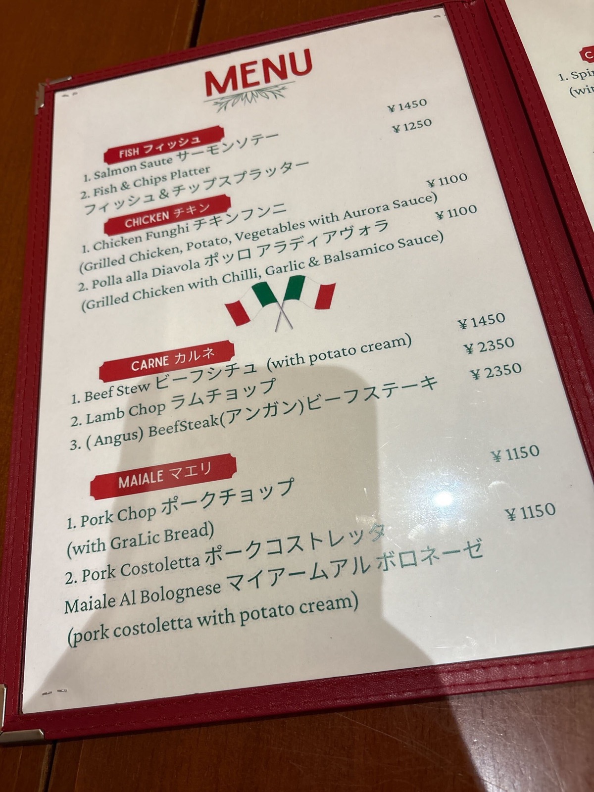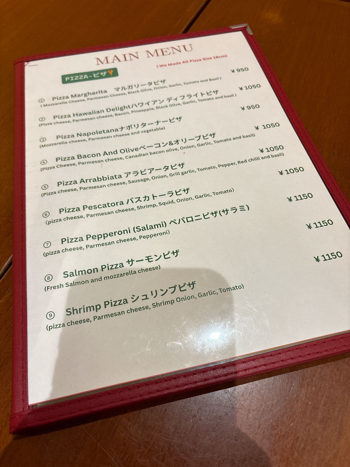 着席してメニューをチェックしていく。まずはイタリア料理店らしくピザや