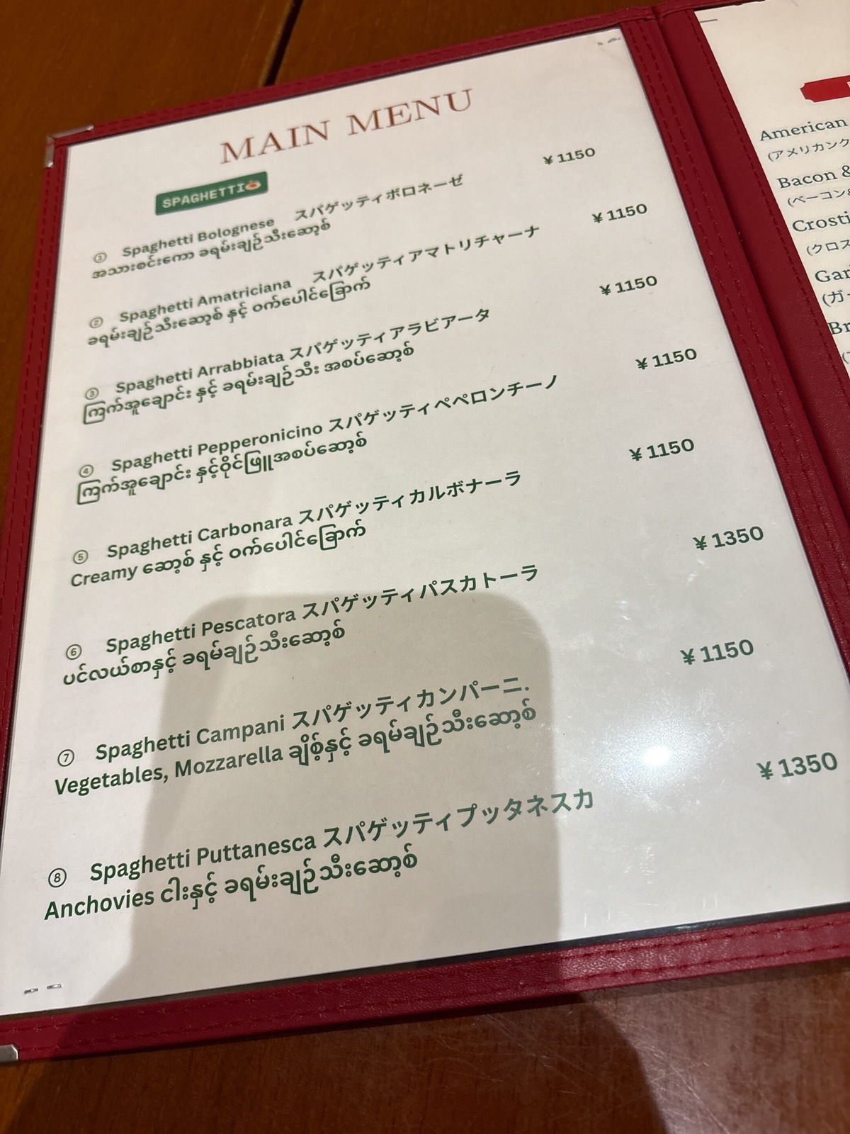 パスタといったメニューが並ぶ。ラザニアやグラタンなどもラインナップしているが、メニューの表記は英語、日本語、ビルマ語と超変則的。