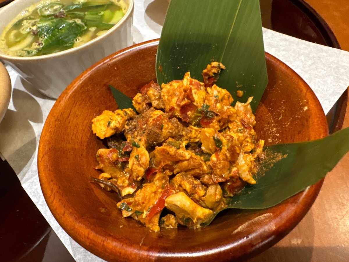 スプーンを持ち上げるとぶつ切りされたナマズの身がゴロゴロと入っている。スープの味は……タイのトムヤムクンを思わせる酸っぱ辛い方向性。魚の出汁やパクチーの香り、肉厚なキクラゲの食感なども楽しい。これは美味しい。ライスにかけて食べても間違いなかった。