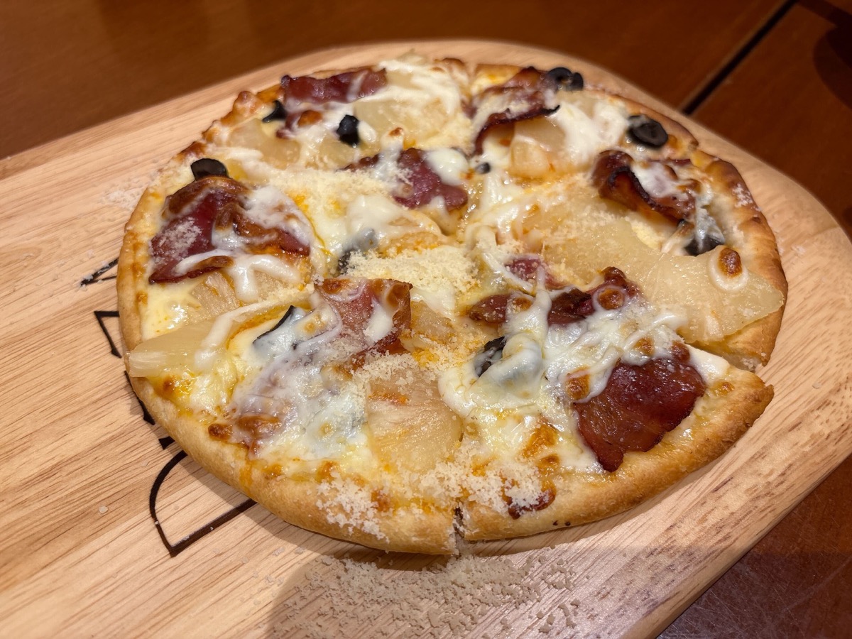 パイナップルとベーコン、オリーブが乗ったピザは複数のチーズを使用していて香ばしくて塩気もちょうどいい。パイナップルの甘みとベーコンの塩味がちょうどいい。自分から進んでパイナップルのピザを食べることはない筆者だが久々に食べてみるとなかなかいいものだ。御花畑記者もご友人も「不思議な甘み……」と驚いていた。