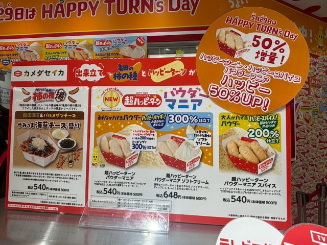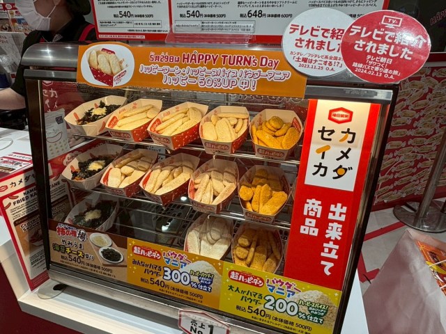 レジ横には、備え付けのキッチンでの出来立て商品として、柿の種をフライして味付けしたものやハッピーパウダーを増量させた「超ハッピーターン」なるものも並んでいる。