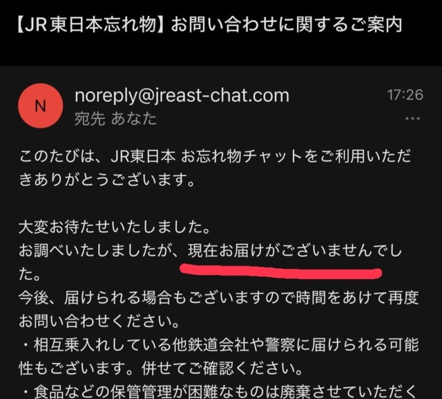 「お問い合わせいただいたお忘れ物について確認しましたところ、東京駅にてそれらしきお品物のお預かりがございました。」だと!?